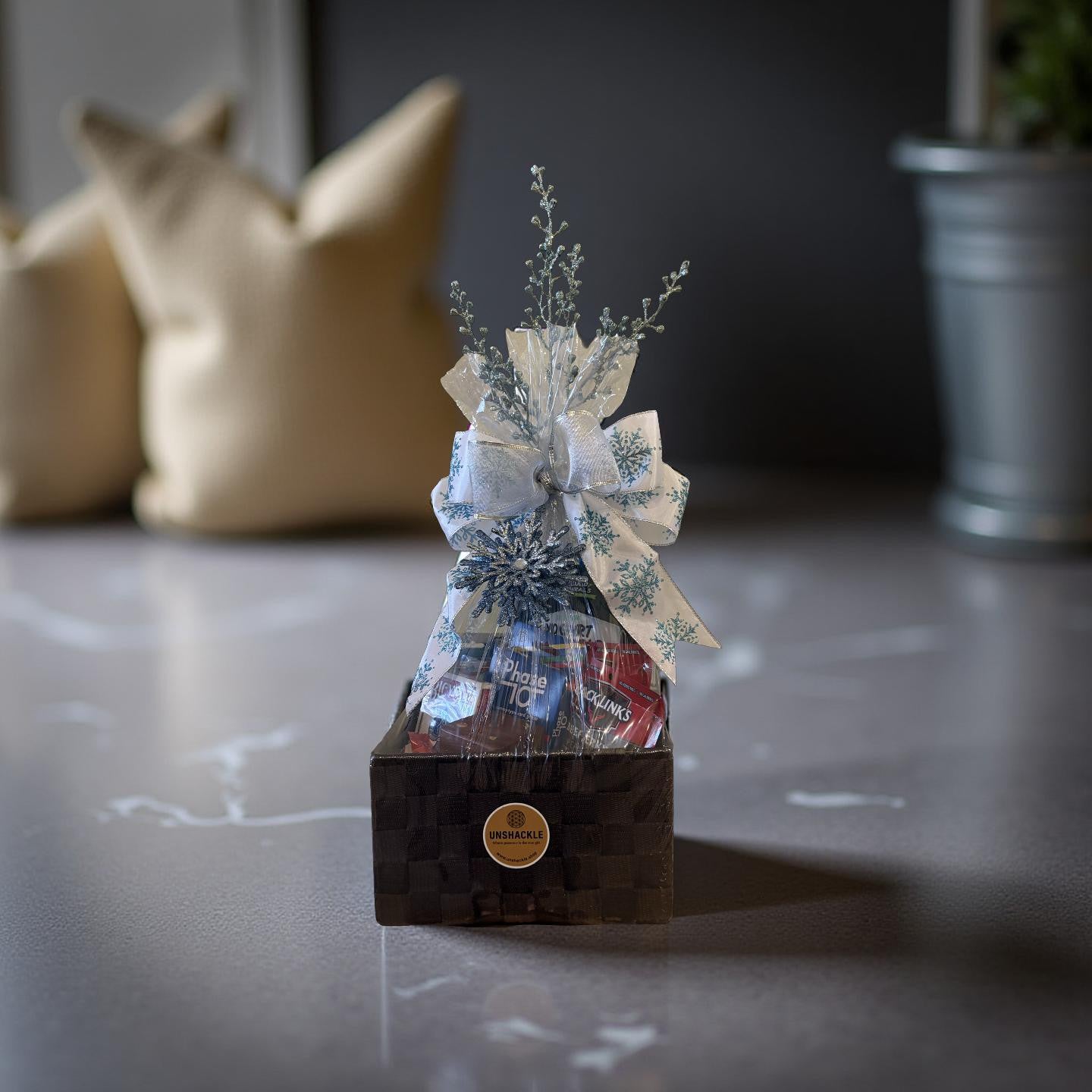 Bring the fun indoors this winter with a festive game-night basket made for laughter, friendly competition, and plenty of snacking. Perfect for families, couples, or anyone who loves cozy nights filled with cards, dice, and good vibes.