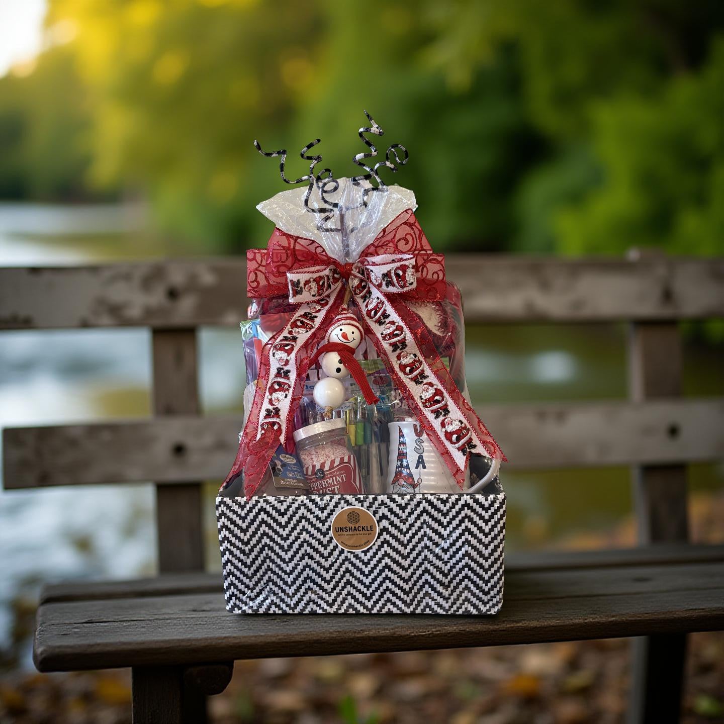This charming basket includes large-print puzzle books, gel pens, rich cocoa mix, peppermint topping, a festive holiday mug, and a soft blanket — everything needed for a peaceful winter evening.