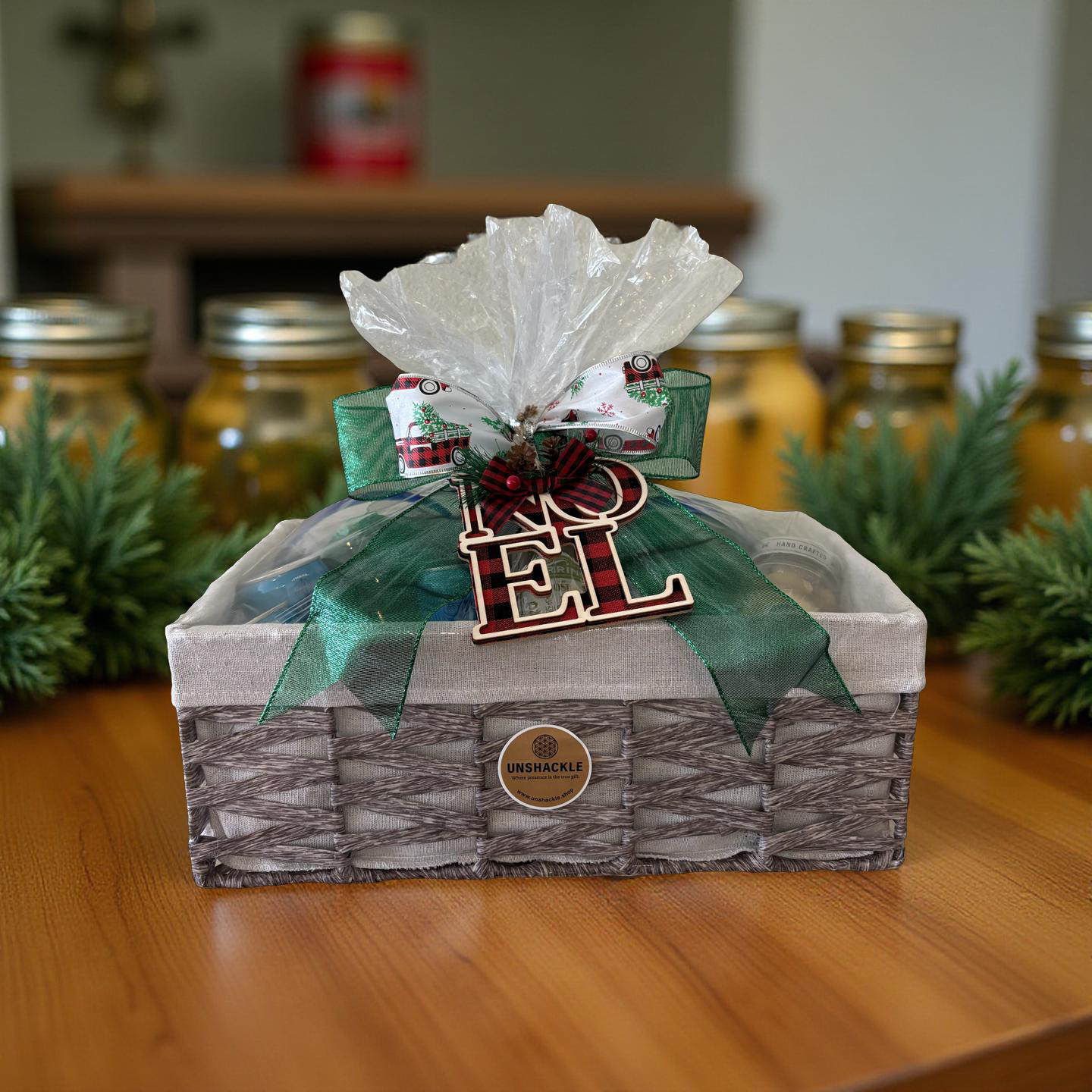 Elegantly arranged in a neutral woven basket, accented with a rich green holiday ribbon and a festive NOEL tag. A stunning holiday gift that blends timeless class with a touch of Christmas sparkle.