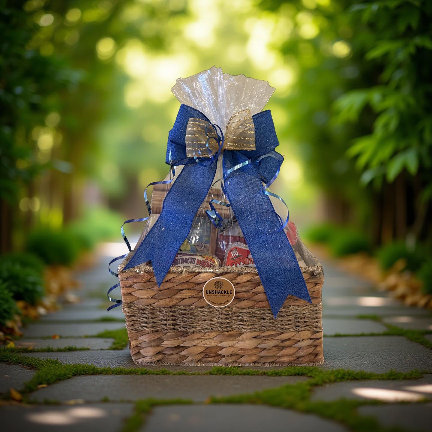 Presented in a woven keepsake basket wrapped in deep blue and gold